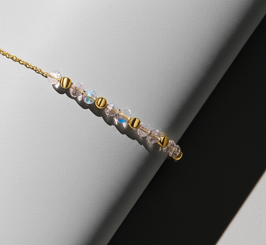 A veces, la belleza más profunda no es la que se ve, sino la que se siente. Esta pulsera no es solo un accesorio, es un recordatorio de los momentos de luz y alegría que llevas dentro. Sus delicadas cuentas de cristal facetado capturan la esencia de la claridad y la positividad, brillando con una luz que refleja tu propia fuerza interior. Las pequeñas cuentas doradas representan los preciosos momentos y los pequeños tesoros que hacen que la vida sea única.